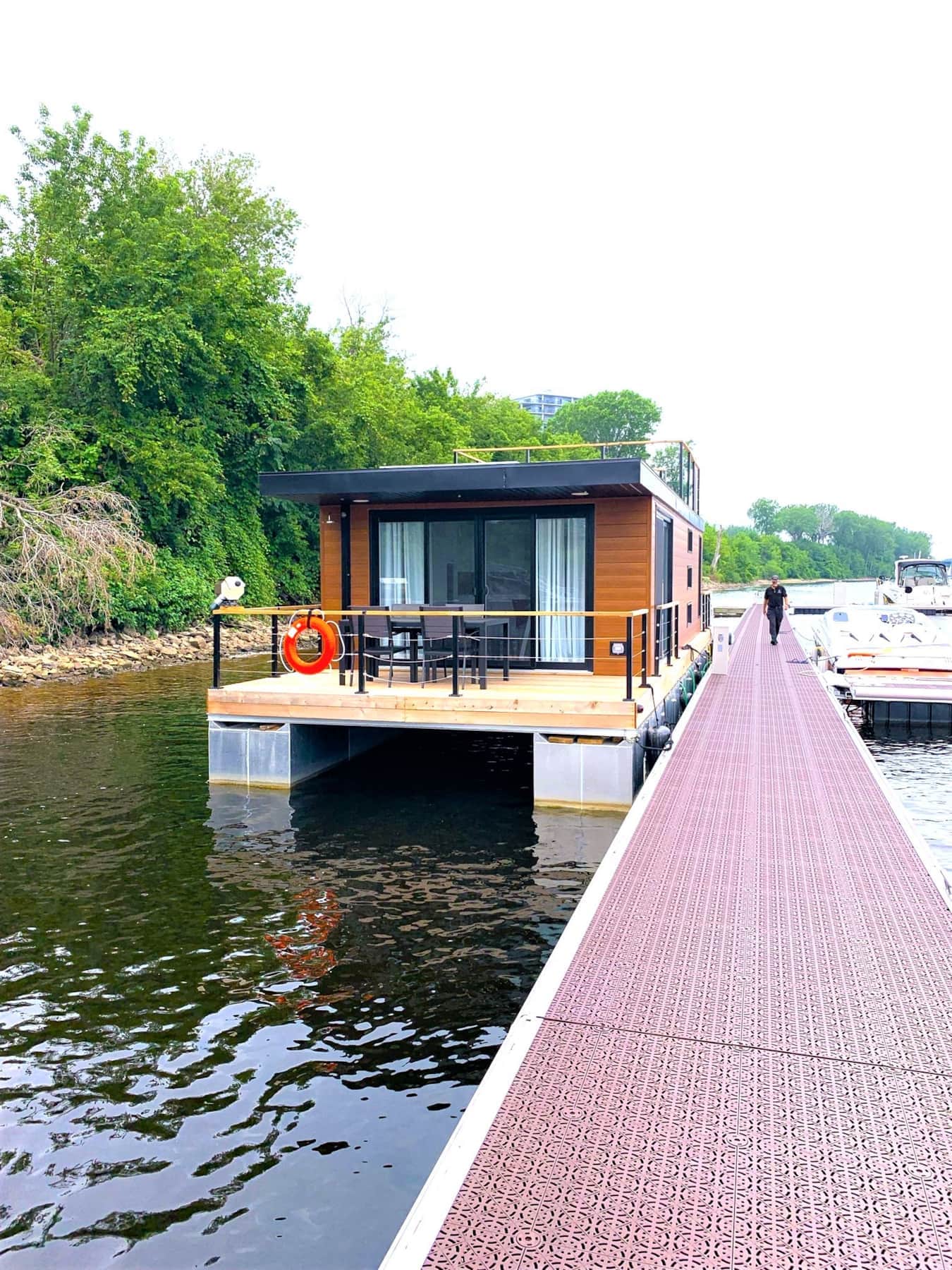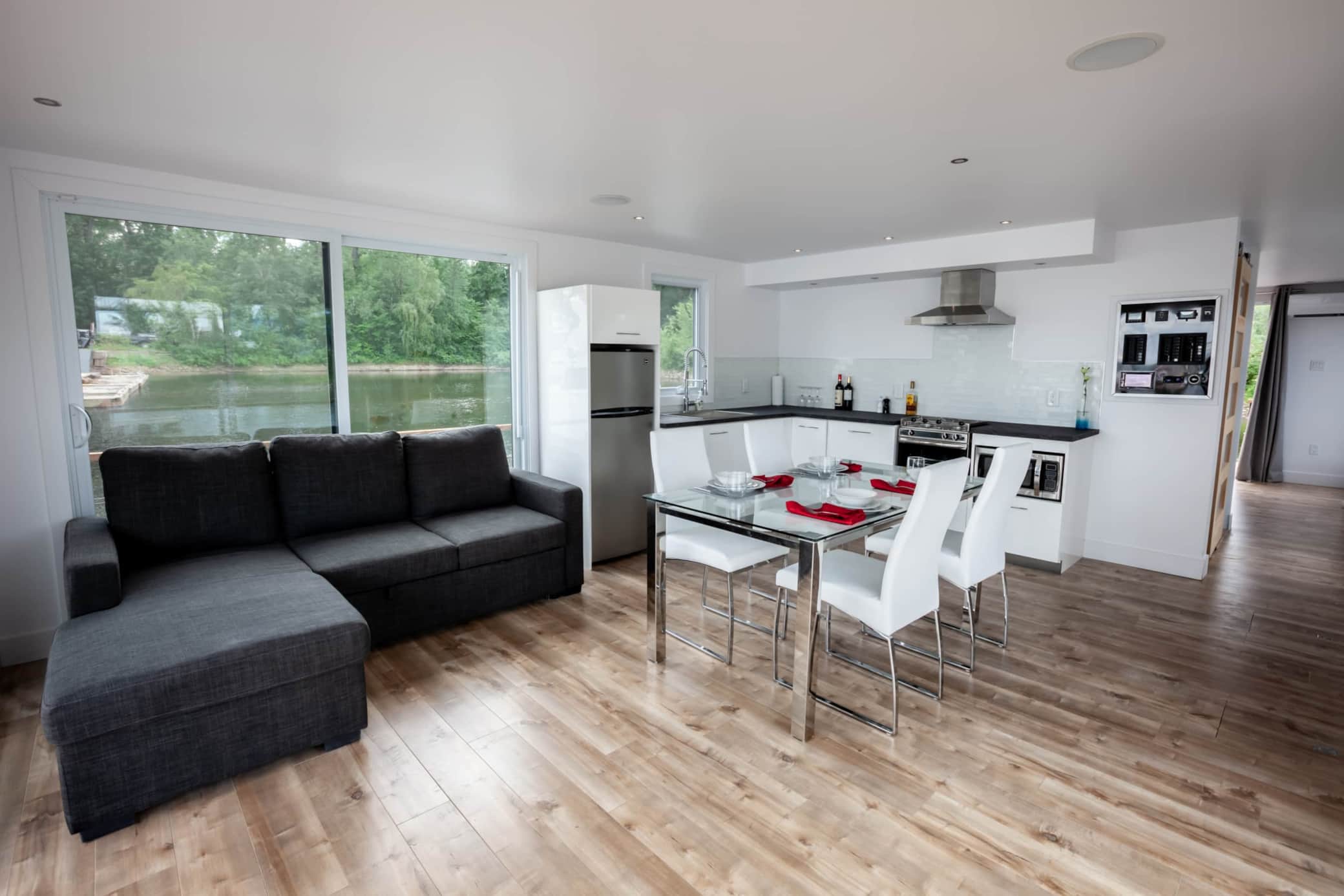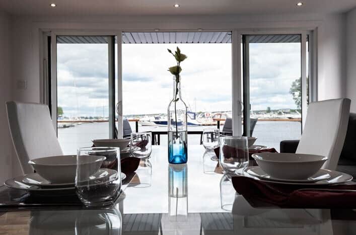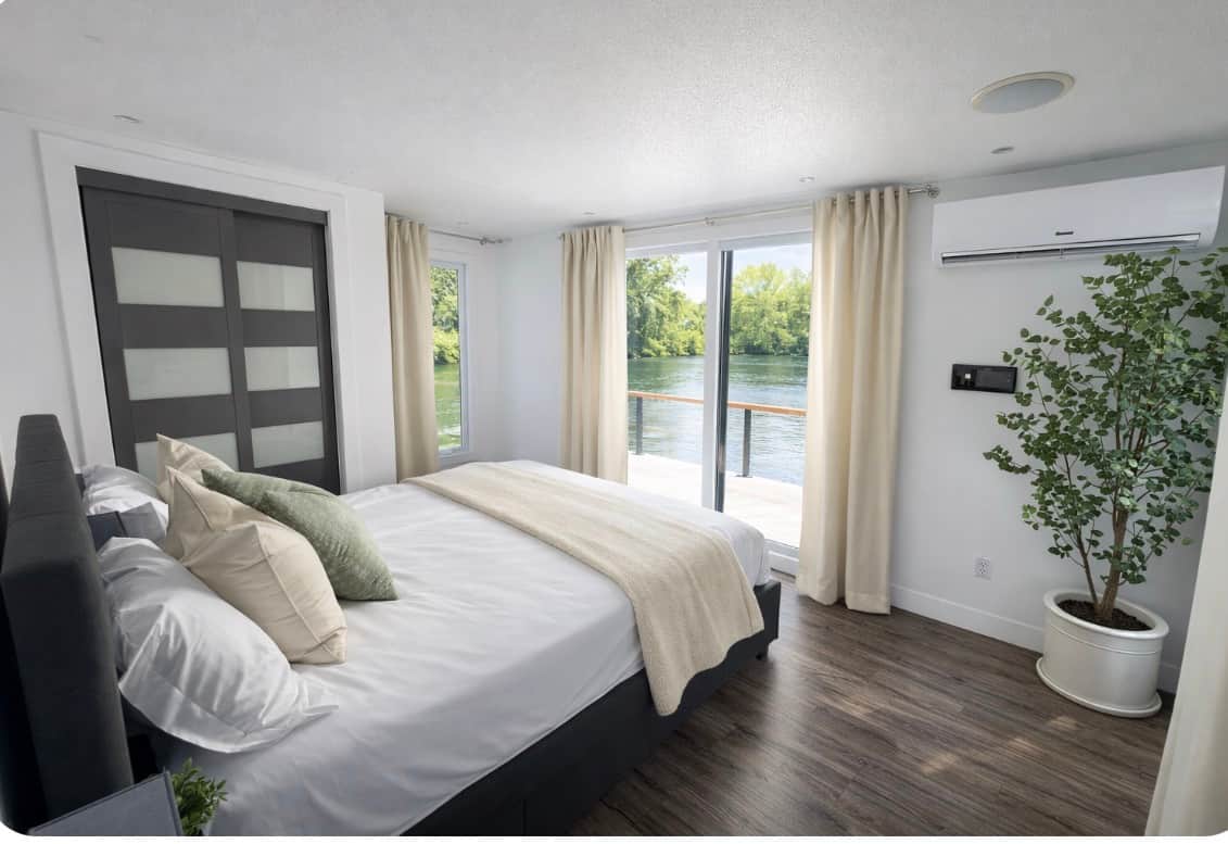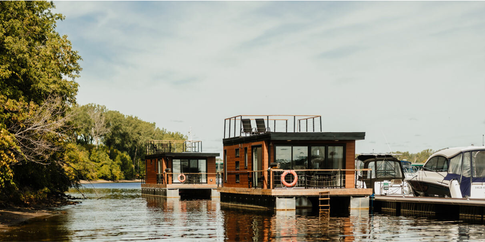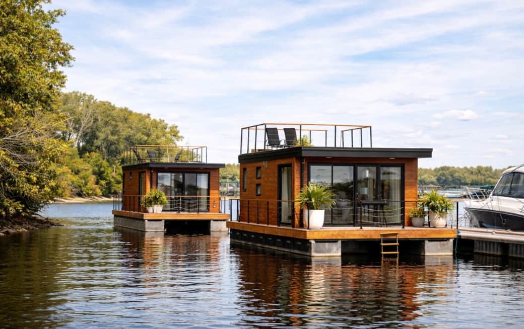 Séjournez dans un hébergement flottant moderne offrant une vue imprenable et une ambiance apaisante.